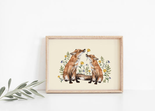 'A Flower For You' Floral Foxes Watercolour Illustrated Fine Art Print