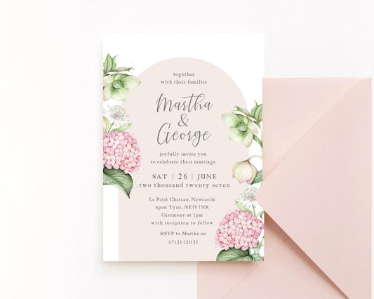 Vintage Hydrangea Wedding Invitation Hellebore Botanical Wedding Invites, Blush Pink Sage Floral A5 or 5x7" Stationery Suite