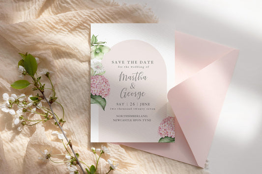Save The Date Invitations, Vintage Hydrangea Hellebore, Botanical Wedding Invites, Blush Pink Sage Floral A6 Stationery Suite