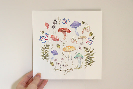 Watercolour Mushroom Fungi Print, Autumn Cottagecore Artwork, Nature Wall Art, Giclee Fine Art Square Print 8x8" or 10x10" A4
