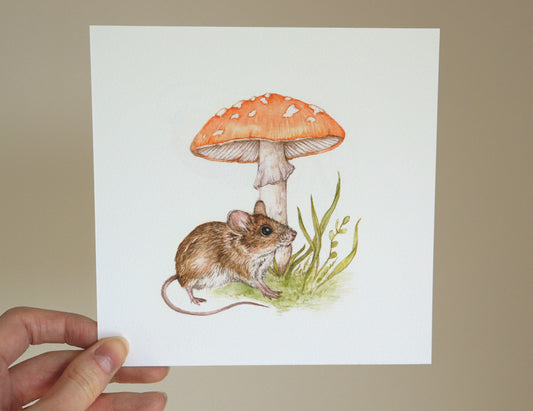 Peach Mushroom and Mouse Print, Watercolour Amanita Fungi Wood Mouse, Nursery Art, Cottagecore Nature Fine Art Square Mini Print 6x6", 5x7"