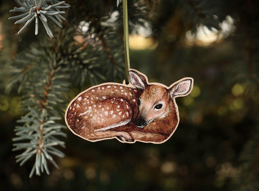 Little Wooden Deer Christmas Tree Decoration, Illustrated Woodland Fawn Ornament Keepsake