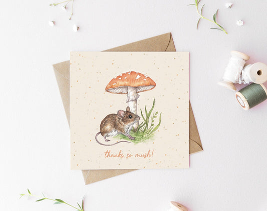 Mushy and Mouse Greetings Card, Thanks So Mush - Watercolour Cute Thank You Illustrated Personalised Card