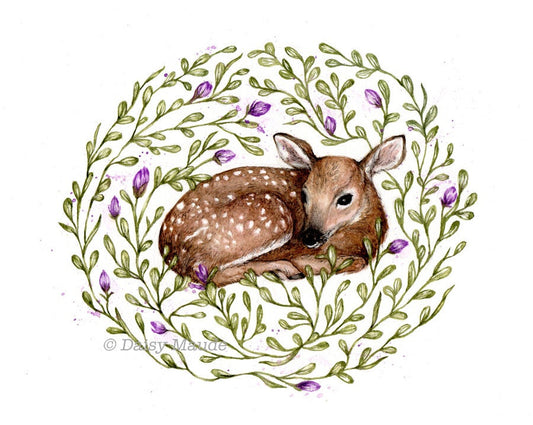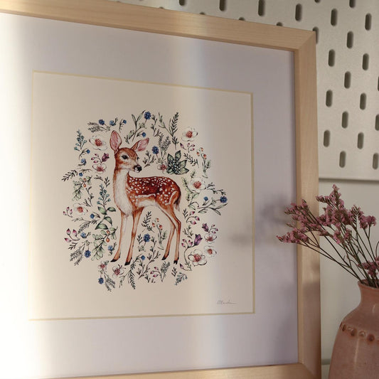 Watercolour Fawn Print, Wildflowers Botanical Deer, Floral Deer Nursery Artwork, Giclee Fine Art Print 8x8" 8x10" 10x10"