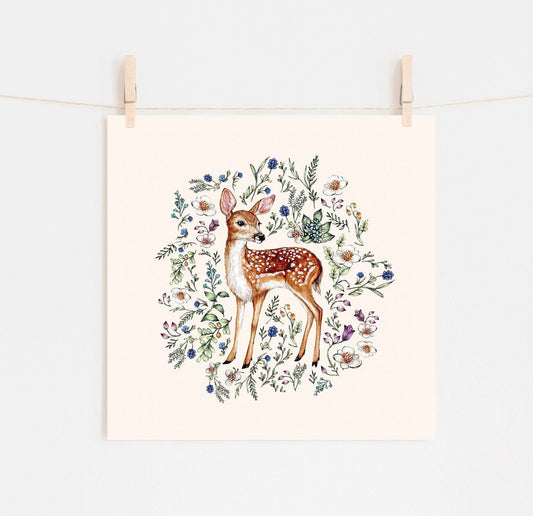 Watercolour Deer Print Square Print Illustration, Fawn Print, Botanical Art, Nursery Art, Nature Floral Art Print - 8x8" 7x7" 5x5"