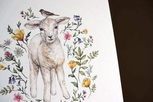 Watercolour Lamb Print, Wildflowers Botanical Spring Animal Floral Sheep Artwork, Nursery Art Print 8x8"
