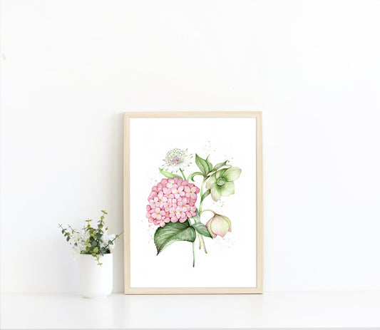 Vintage Florals Watercolour Giclee Print, Hydrangea Hellebore Astrantia Art A5, A4, A3