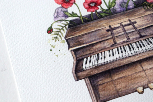 Watercolour Piano Print, Floral Notes, Wild Poppies Flowers Illustration Giclee Fine Art Print 8x10"
