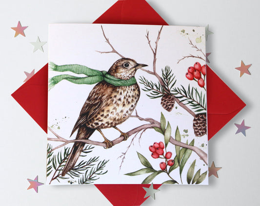 Song Thrush Bird Christmas Card, Watercolour Illustrated Xmas Greetings Card