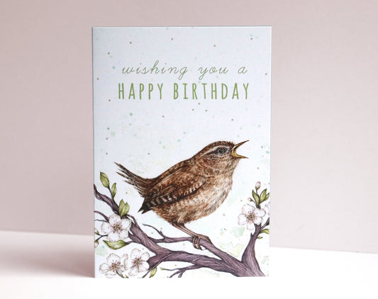 Chirpy Wren Greetings Card, Bird Birthday Card Cute Floral Watercolour Illustrated Card A6