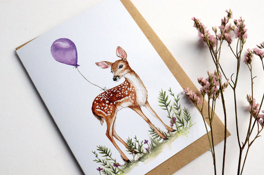 Florence the Fawn Greetings Card, Watercolour Illustrated Deer With Balloon, Animal Birthday Card For Mum Sister Friend A6