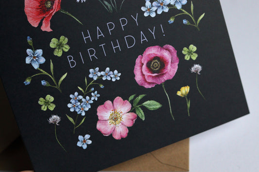 Dark Botanical Happy Birthday Card for Mum Grandma Friend Sister, Floral Watercolour Illustrated Wildflowers Greetings Card