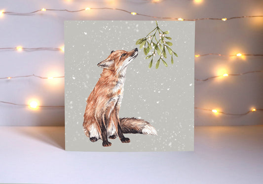 Mistletoe Fox Christmas Card, Snowy Woodland Animal Xmas, Watercolour Greetings Card