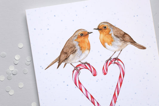 Candy Cane Robins Christmas Card, Sweethearts Watercolour Mum and Dad Couple Greetings Card