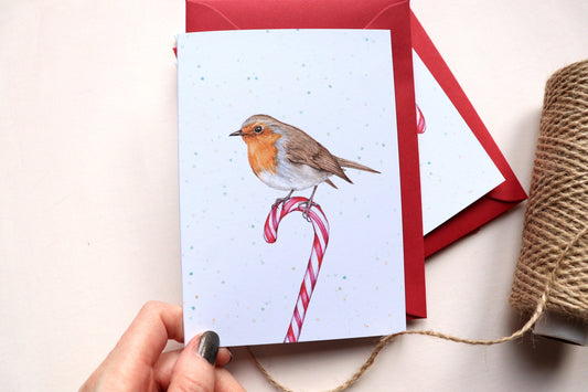 Candy Cane Robin Christmas Card, Watercolour Bird Festive Greetings Card A6