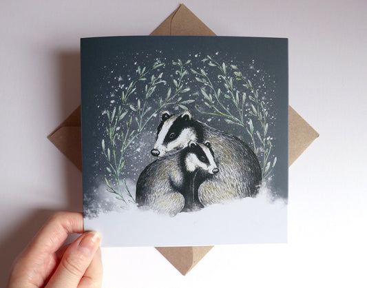 Cosy Badgers Christmas Card, Snowy Illustrated Watercolour Couple Personalised Greetings Card