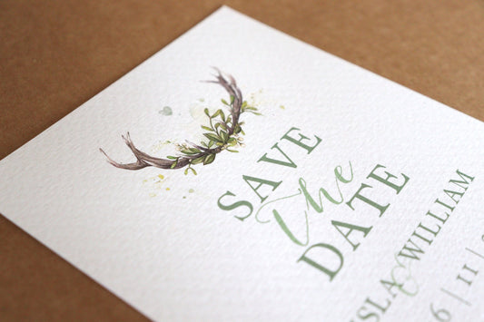 Woodland Antlers Save The Date Invitation, Minimal Rustic Scottish Wedding Invites Suite A6