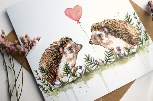 Hedgehogs Greetings Card, Watercolour Hedgehog Valentines Couple Anniversary Birthday Balloon Illustrated Card