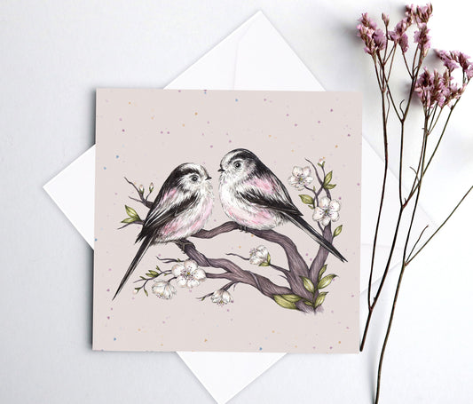 Long Tailed Tits Greetings Card, Anniversary Birthday Wedding Couple Watercolour Illustrated British Bird Mother's Day Card