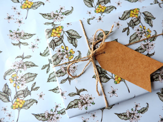 Coffee Plant Floral Wrapping Paper Blue Botanical Patterned Birthday Gift Wrap Sheets
