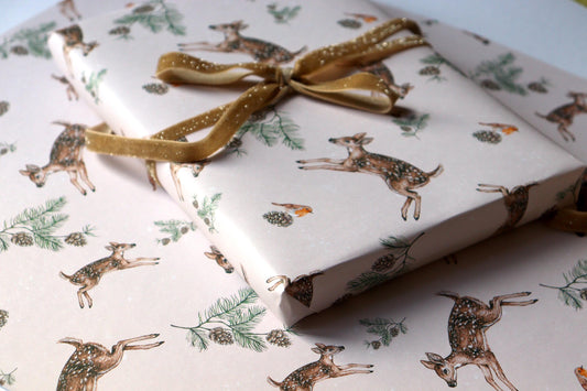 Christmas Fawn Wrapping Paper, Winter Robin and Pine Cones Pattern, Deer Gift Wrap Sheets