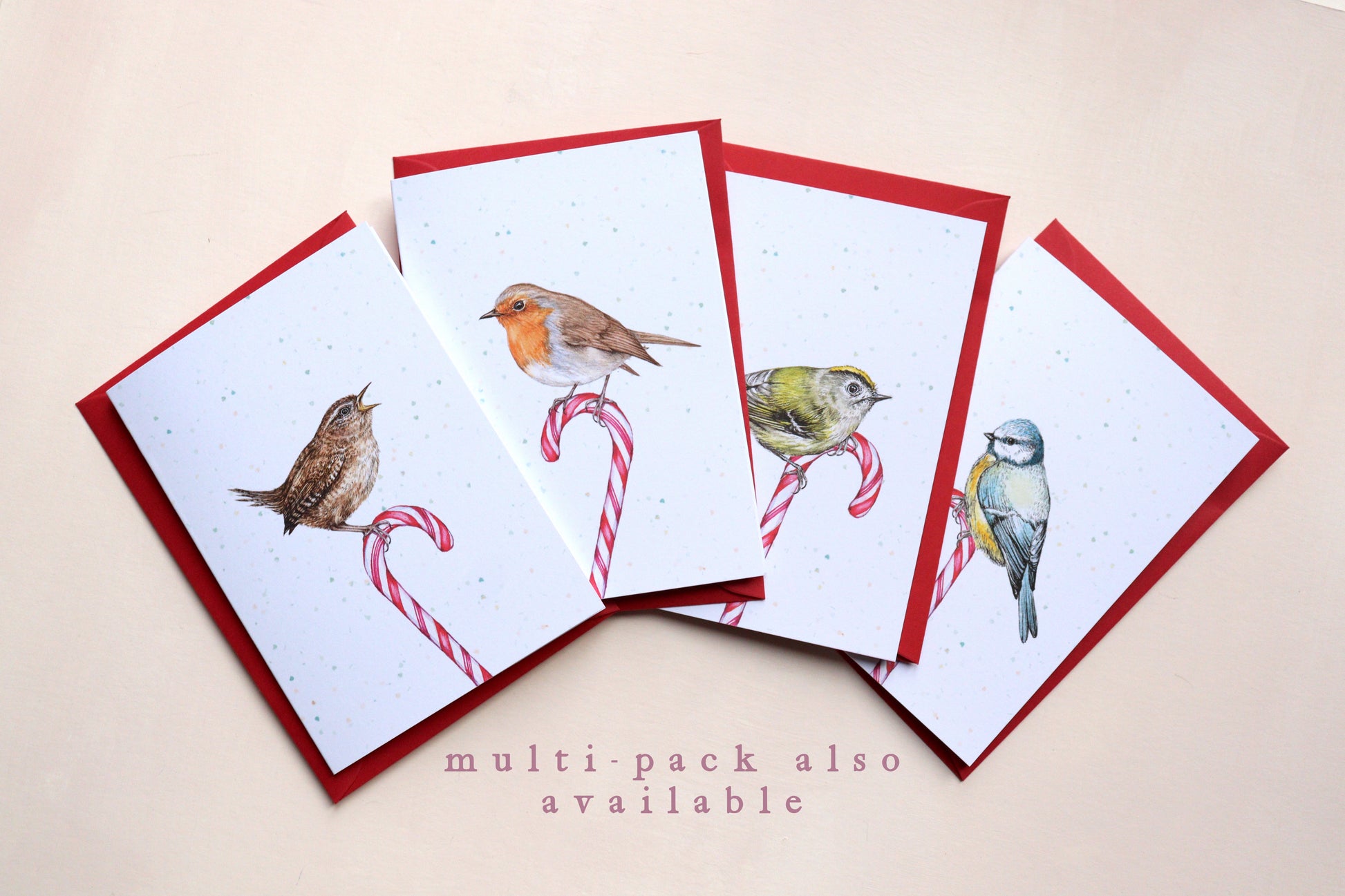 A sweet festive wren card, from my candy canes collection. Printed onto a white background with delicate blue flecks. Perfect to send to a bird lover in your life - the card is left blank inside for your own message ❤️ You can choose to select 1 wren card, a pack of 4 wrens, or a pack of 4 featuring all designs in the collection.