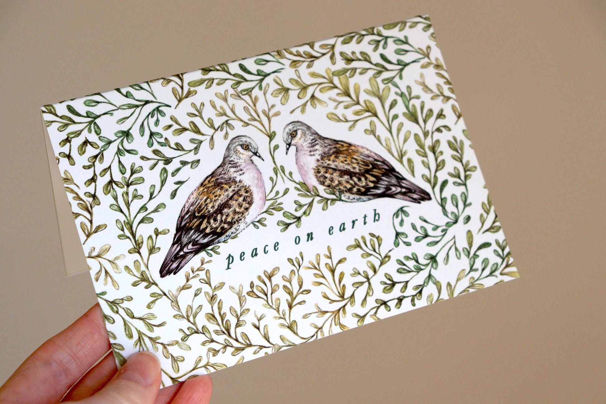 A thoughtful festive greetings card, featuring two watercolour turtle doves, surrounded by green foliage with the words 'Peace on Earth' printed beneath them.