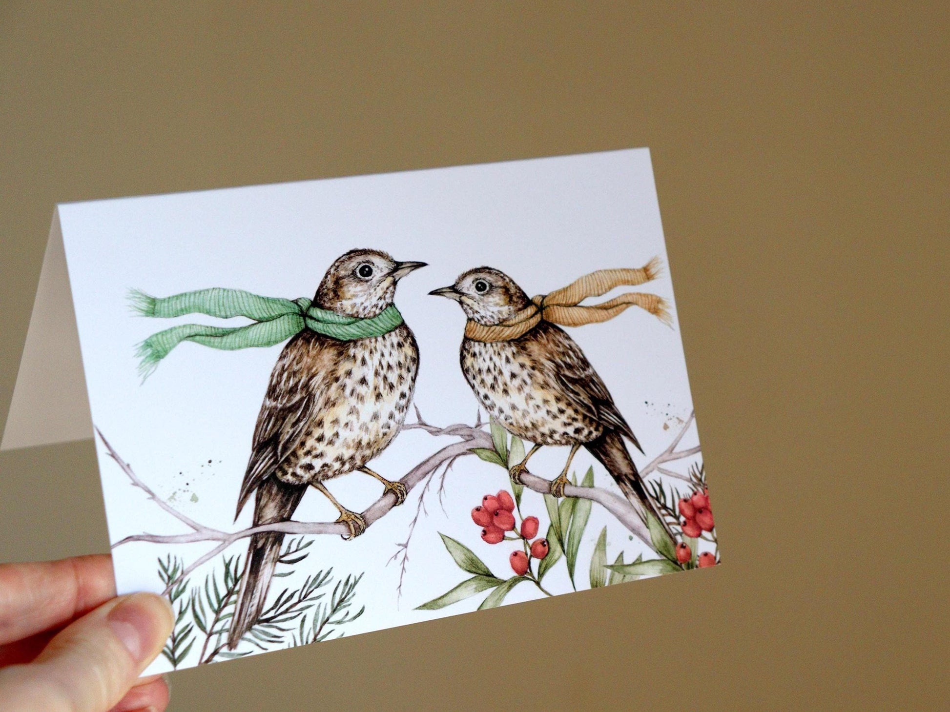 Song Thrush Couple Birds Christmas Card, Watercolour Illustrated Xmas Greetings Card - A6